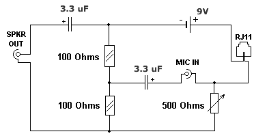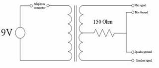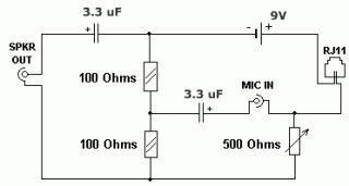 En el esquema anterior se podría reemplazar el costoso transformador hibrido usando en su lugar un divisor resistivo (formado por dos resistencias de 100 ohmios) conectando dos condensadores de desacoplo (para no permitir el paso de corriente continua al auricular y micrófono) y por ultimo deberíamos dotar de un ajuste del circuito para suprimir el eco y ajustar la ganancia.