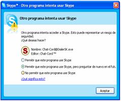 Este se pondrá en contacto con la API de Skype para acceder a esta, y por tanto nos preguntara si deseamos que el programa Chat-Cord acceda al marcador de Skype.
