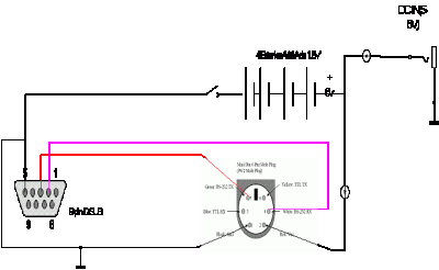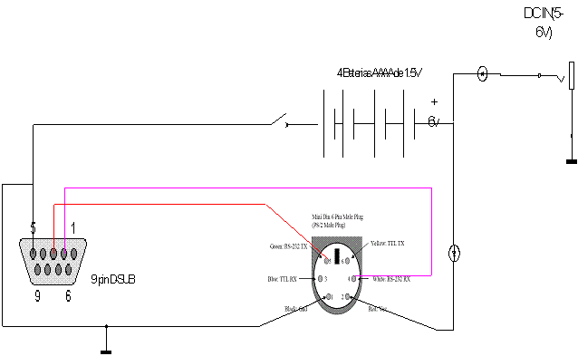 Así las cosas en el dispositivo adaptador que proponemos, conectaremos por un lado el conector cannon de 9 pines procedente de la base hot-sync de la Palm y por otro lado conectaremos el conector ps2 procedente del receptor GPS, uniendo las masas entre si de ambos dispositivos y sus respectivos líneas de recepción y transmisión RS232 y por ultimo conectando 4 baterías AAAAA en serie entre los pines 2 y 1 del conector ps2.