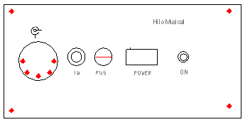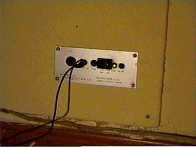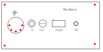 Por ultimo la «Centralita de hilo musical» la meteremos ,si es factible en una barata caja de registro de medidas apropiadas (26×26 es suficiente espaciosa para contener la fuente , la parte de audio, la entrada de C.A. y la salida del bus ), practicándole en la parte delantera un pequeño frontal en el que colocaremos el interruptor de encendido, el led de puesta en marcha, el pentapolar hembra de pruebas, el jack estéreo de 3.5″ de entrada y acaso un fusible (evidentemente tanto la entrada de c.a, como el bus de 4 hilos han de instalarse en un tubo aparte que ira a esta caja)