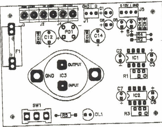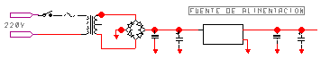 En cuanto al diseño de la fuente no puede ser mas sencilla, estando constituida en torno a un transformador de 12V 2Amp (aunque podemos equipar con uno de menor amperaje en funcion del numero de altavoces que vayamos a conectar), un puente de diodos compacto del tipo B80C330, y dos condensadores a la entrada del regulador de potencia UA7812 (podemos poner también un 7812 con un buen radiador si elegimos un transformador menor) .Al regulador integrado le equiparemos el oportuno radiador y a su salida nuevamente conectamos los típicos condensadores de filtro. A esta punto conectaremos tanto a la «Centralita de hilo musical» (que no es ni mas ni menos que el amplificador de audio descrito anteriormente) como al bus de 4hilos que llevaremos por todo el recinto.