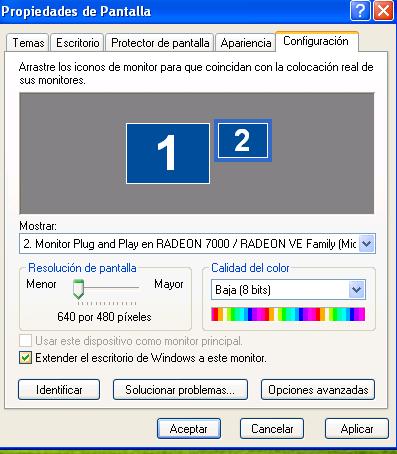 5-Seleccione el monitor secundario una Resolución baja (640 x480) y una calidad de color de 8 bits y pulse en la pestaña «Extender el escritorio de Windows a este monitor», aplique y acepte los cambios.