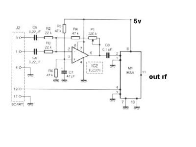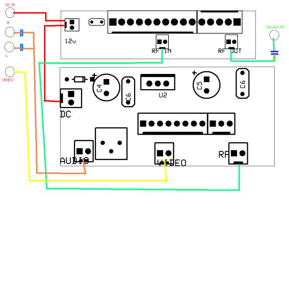 Dado que el MAV 224 contiene toda la electrónica necesaria para la constitución de un modulador de RF, tan solo deberemos alimentarlo con 5V estables, y conectar las señales de entrada de audio y video a sus terminales.