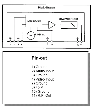 Este circuito hibrido incorpora un ircuito transmisor de audio y vídeo de alta calidad muy estable en la frecuencia con un destacadísimo alto rechazo armónico, además operando en la banda de VHF en el canal 12 a 224.5 MHZ de VHF ,la cual puede ser recibida con cualquier receptor de TV estándar.