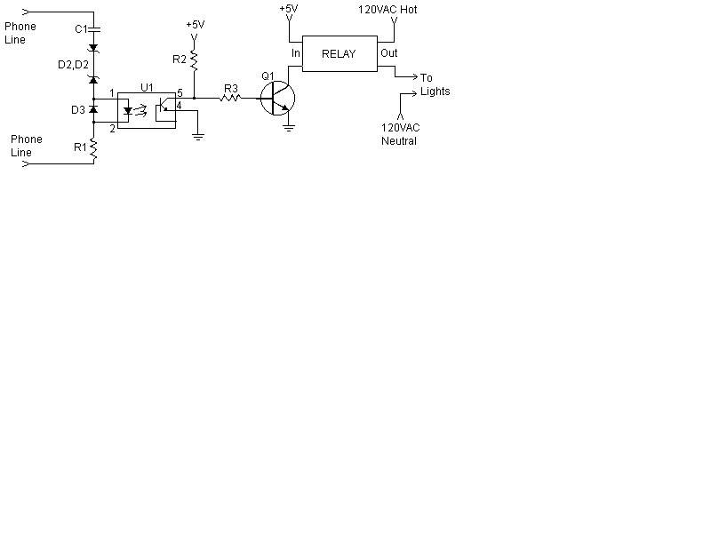 NOTA: Usted puede conseguir el trabajo de circuito por sacando D1 y D2 y substituyéndolos con un cortocircuito. Los trabajos de circuito después entonces, pero es posible que en este caso algún ruido de voltaje bajo sobre la línea pueda hacer que el circuito suene. Países diferentes tienen datos específicos diferentes sobre como voltajes bajos no deberían hacer que un teléfono suene en absoluto. PS. Si le interdescansan en la utilización theis cirucit como la base para controlar algún alto poder cirucitry mira a http: // http://www.aaroncake.net/circuits/pflash.htm para un ejemplo de circuito como conducir un relevo cuando el toque(anillo) es descubierto.