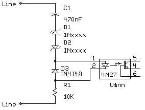 Realmente el circuito es bastante sencillo ya que consta de un pequeño limitador formado por C1,D2,D3 y R1, el cual alimenta a U1 (que esta optoaislado del resto del circuito).