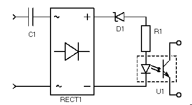 Otro apprach para el descubrimiento de toque(anillo) debe usar un circuito de rectificador de onda(ola) lleno para convertir la señal de signo de corriente alterna a la corriente continua conveniente para optoisolator y luego poner la corriente la resistencia restrictiva y el diodo zener a la salida de rectificador.