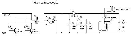 Usualmente muchos circuito del estraboscopios operan directamente de voltaje dela red, pero este circuito usa CORRIENTE DIRECTA del 12V CORRIENTE ALTERNA Ésta es idea muy buena si usted no quiere travesear voltaje directo de 220v al circuito o usted quiere utilizar el flash estroboscopio a baterías. El circuito tiene algunas funciones especiales comparadas para otros circuitos del estroboscopio encontrados en los libros de electrónica.