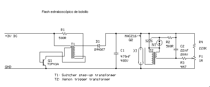 El principio de funcionamiento: Q1, R1, T1 y D1 forman un convertidor DC-DC para convertir el voltaje del + 3V de baterías a + 200..+El voltaje del 500V cargan el condensador principal del destello C1.La resistencia R4 y el potenciómetro P1 forman un divisor de voltaje y C2 se varía de ese voltaje a traves de R3. Cuando C2 carga hasta un voltaje del 70V, la bombilla de neón N1 en el circuito comienza a dirigir y provocar al triac Q2. El Thyristor causara la descarga de C2 a través de transformador del gatillo T2, lo cual genere un alto voltaje corto (2..4 kV) el pulso que provoca el instante el tubo X1. Luego el condensador principal del destello C1 descarga a través de tubo del destello y el tubo genera un destello brillante. Nuevamente la carga de C1 comenzara de nuevo.