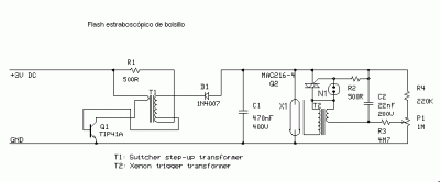 ATENCION:El alto voltaje de unidad del destello de la cámara puede causar una sacudida grave y posiblemente fatal. El condensador de almacenamiento de energía puede retener alto voltaje peligroso después incluso de haver dejado de alimentar el circuito Los transformadores (T1 y T2), el tubo del destello (X1), la bombilla de neón (N1) y el circuito impreso estaban en la unidad original del destello. Casi todas otras partes se han variado.