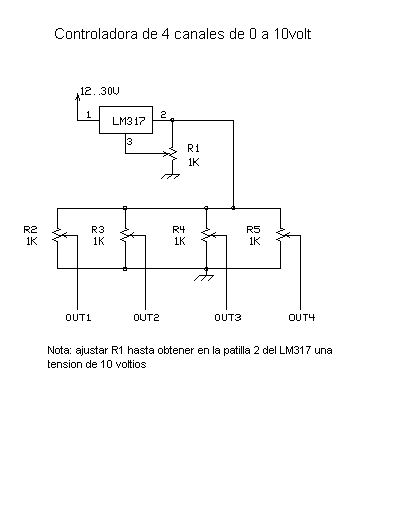 El voltaje que proporciona el regulador necesita ser ajustado para obtener exactamente el voltaje de salida del 10V. El voltaje de salida se ajustara girando R1 y cotejando el voltaje de salida con un multimetro. El voltaje regulable del LM317, nos permitiría ajustar a otro estándar de voltaje de control (esas son muy raras pero existen en algunas aplicaciones). El regulador IC no necesita ningún disipador de calor especial porque la corriente de salida es realmente pequeña (alrededor de 40 + corriente de miliamperio tomada de las salidas).
