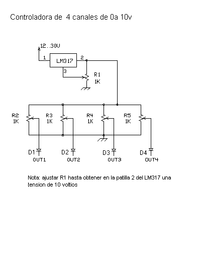 La salida del controlador será un voltaje estable de CORRIENTE DIRECTA variando entre 0 y 10V. El 0V representa apagado y 10V sera el máximo en adelante. Los controladores pasivos, con salidas no moderadas, usarán potenciómetros con un valor de resistencia de ohmios del orden de 10K o menos. Este circuito usa resistencias de 1 kohm para el buen desempeño y una impedancia baja de salida. Es recomendable que los controladores y los dispositivos de salida tengan limitada la corriente que proporciona en todo sus alidas algo semejante ya que no pueden resultar dañados por cortos circuitos debido a tener señales comunes. La señal de control y todo los elementos del conector de control estarán apartados de lineas de CORRIENTE ALTERNA (la línea y la de neutro). Es importante que la señal de control esté apantallada con tierra . La protección de corto circuito en este circuito es provista en el caso cuando el suministro de fuerza haya sobrepasado el limite de capacidad de la corriente de salida del LM317. Las señales de control están con creces aisladas en este diseño. ESTA E1.3, Entertainment Technology – Iluminando Sistema de Control – 0 para 10V Analog Control Emite El Protocolo, Draft 9 junio de 1997 (CP/97-1003r1) describe también que los controladores y los dispositivos de salida serán provistos de un diodo bloqueador (o un circuito similar) algo semejante a que cada salida presenta un circuito abierto a cualquier voltaje de la fuente de más que sí mismo. Los diodos bloqueadores dan salidas o controladores múltiples permiso de ser monitoreareado por los mismos apagadores o los aparatos receptores en una «precedencia más alta de tomas» base.