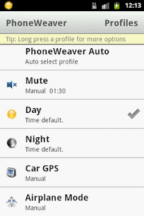 Cada perfil puede controlar completamente el volumen del teléfono / vibrar, tonos de llamada, notificaciones, WIFI, Bluetooth, datos 3G, GPS, pantalla y mucho más. Usted puede incluso lanzar aplicaciones cuando se activa un perfil! Este plugin le permite administrar de forma remota y PhoneWeaver swich entre los cuatro primeros perfiles mostrados en el menú. Mostrará el perfil de ejecución y se puede seleccionar el modo Auto. Silenciar el reencuentro, configurar el dispositivo en el modo de vuelo, o activar los datos móviles para la sincronización de correo electrónico sin siquiera sacar el teléfono del bolsillo!