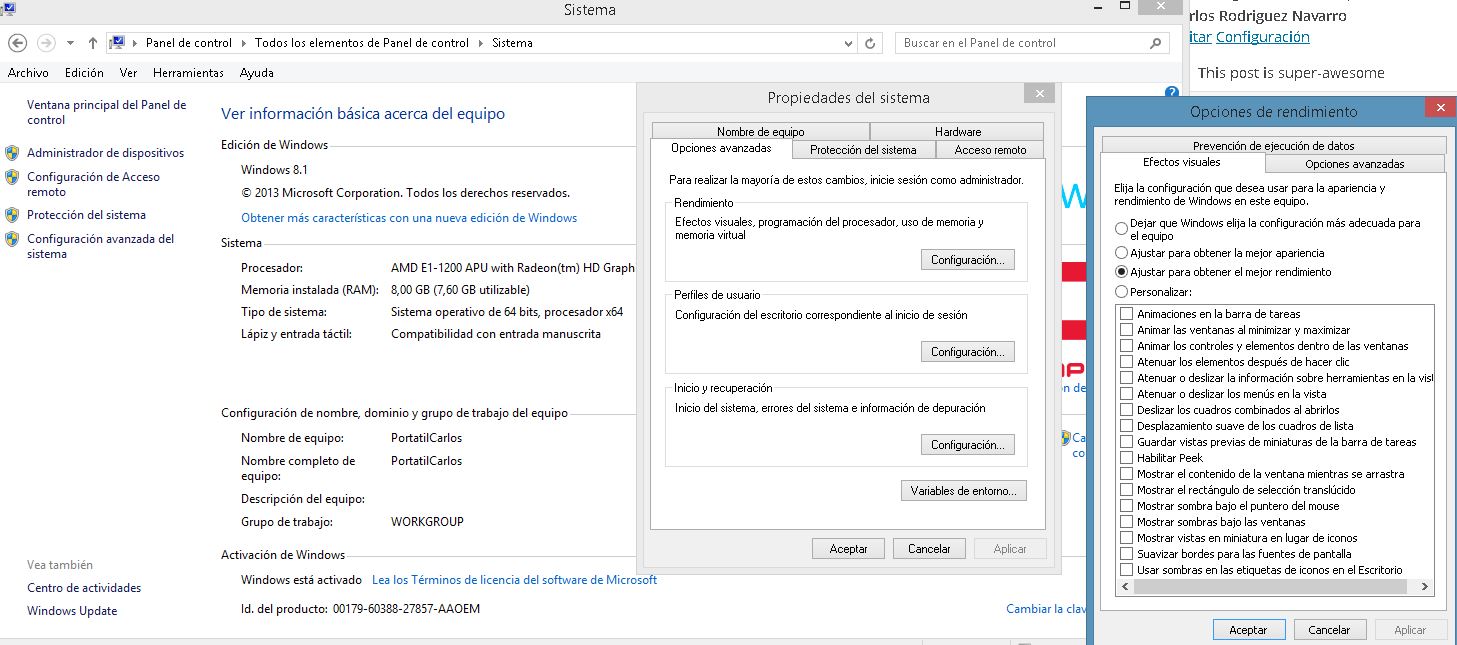 Otro camino es en Información de PC–>Configuración avanzada del sistema .Váyase a Rendimiento y Configuración. Estando en la rama Panel de control\Todos los elementos de Panel de control\Sistema vaya a Ajustar para obtener el mejor rendimiento.