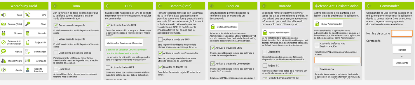 Es una  aplicación para encontrar teléfonos enAndroidMarket  con  nuevas características, será más fácil que nunca encontrar tu teléfono.¿Perdio  el teléfono?Where’s My Droid puede elevar el volumen de tu teléfono y activar el tono. La aplicación puede entregar las coordenadas GPS, junto con un link a Google Maps, si es que no estás lo suficientemente cerca como para escucharlo sonar. Puede rastrear su teléfono desde donde sea a través de notas de atención vía texto u online vía Commander.