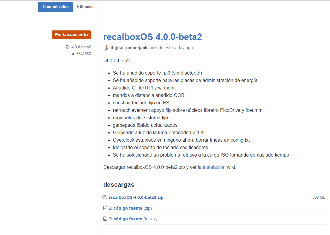 Para descargar la imagen de la distro, simplemente debe ir al repositorio de github de Recalbox ,es decir ir a https://github.com/recalbox/recalbox-os/releases y descargar ‘recalboxOS-4.0.0-beta1.zip’ , lo cual ocupa unos 600Mb.