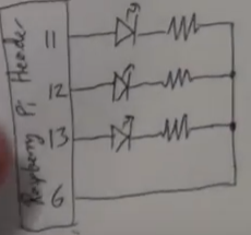 El esquema como podemos simplemente usa los pines 11,12 y 13 y la masa (pin6) del conector de aplicación de la Raspberry Pi para conectar simplemente tres leds de colores al que solo se han conectado tres simples resistencias para limitar la corriente que circula por el puerto: