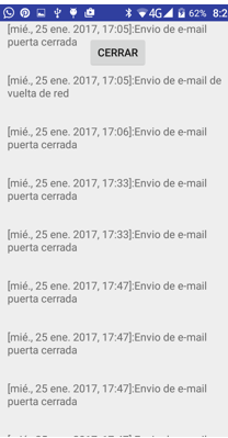 Siempre que se haya definido un nombre valido de fichero en la pantalla de configuración, y el terminal cuente con al menos con 128MB de espacio en la SD externa para almacenamiento de logs, se mostrara en cada línea del log la fecha y hora junto el tipo de notificación (SMS o e-mail) y los motivos (corte o vuelta de red y puerta abierta o cerrada).