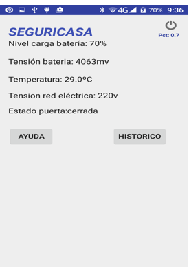 Inmediatamente al iniciar la aplicación, aparecerá la pantalla principal de la aplicación donde se muestra la información básica del estado de los sensores, la cual incluso cerrándola queda en segundo plano con objeto de seguir monitorizando la vivienda o inmueble.