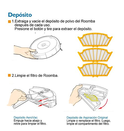 Los filtros convencionales y filtros Aerovac, al igual que los cepillos y el depósito, los filtros deben ser limpiados de vez en cuando para que Roomba siga limpiando con total eficacia.