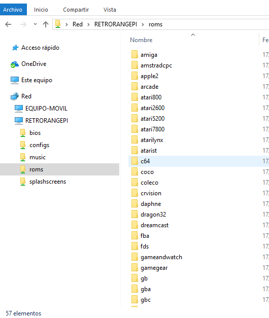 Una vez descomprimido la colección de binarios de los diferentes juegos, el proceso de copia de estos a la placa es muy sencillo pues  teniendo en cuenta que ambos equipos ( la placa  y nuestro pc)  están en la misma red, solo tendremos que buscar desde el explorador de windows  la ruta \RETRORANGEPI\roms