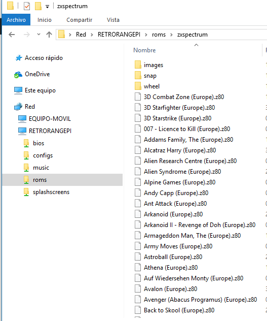 Sobre cualquiera de las plataformas  a la nos hayamos descargado y descomprimido  la colección  de juegos si pinchamos sobre la carpeta  de red  correspondiente( en el ejemplo \RETRORANGEPI\roms\zxspectrum)  es ahí donde deberemos copiar el conjunto de ficheros