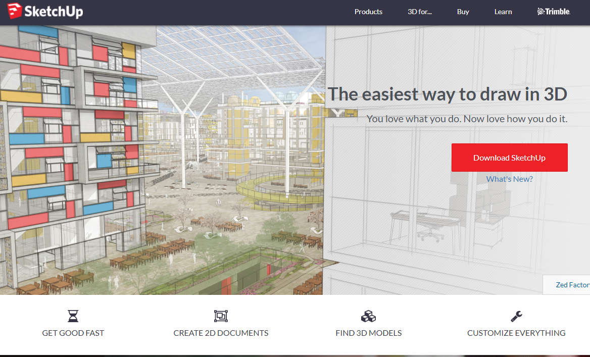SketchUp – antiguamente Google SketchUp – es un completo software de modelado 3D que ahora es propiedad de la empresa de arquitectura Trimble Buildings. SketchUp está disponible como una versión comercial llamada SketchUp Pro y como la edición gratuita de SketchUp Make. Al instalar diferentes complementos, puede ajustar SketchUp a sus preferencias personales. Puede descargar la edición gratuita de SketchUpMake desde su sitio web oficial.