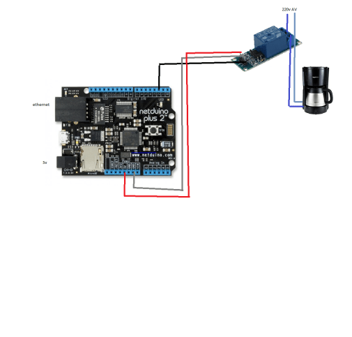 En este ejemplo   vamos demostrar lo fácil que resulta controlar una cafetera  ( o lo que quiera ) desde Internet  por medio de una placa  Netduino+   que esta conectado a  la red ethernet