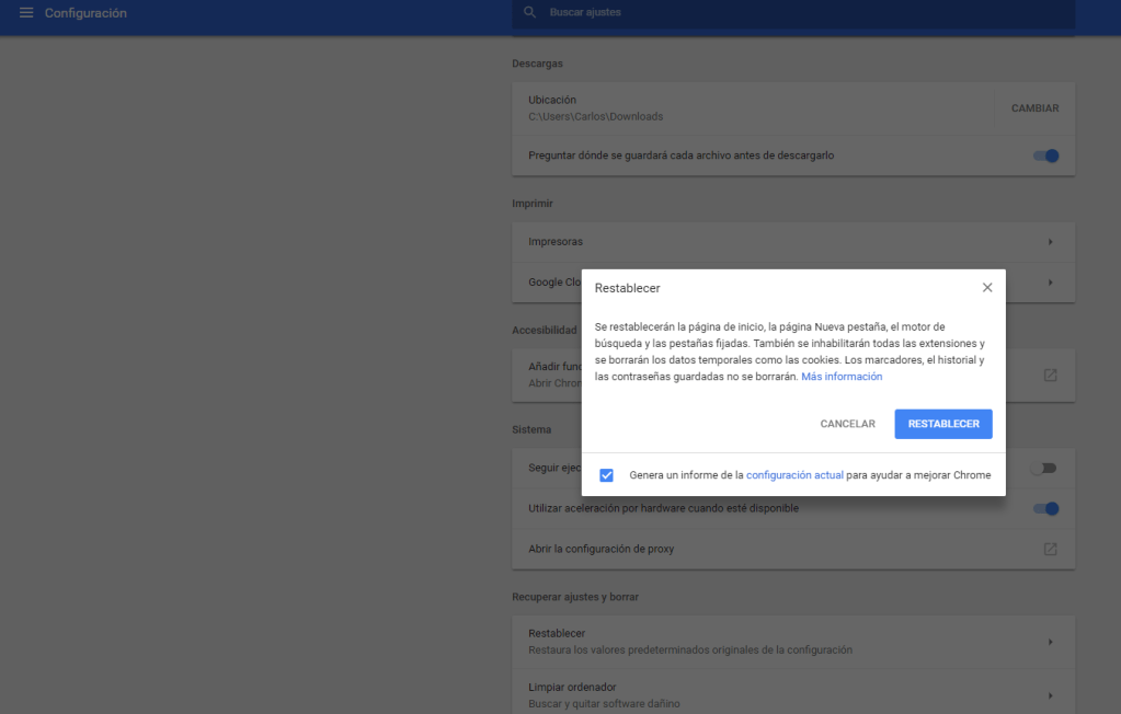 Si con esta medida ha solucionado el problema !enhorabuena! y no tiene que investigar mas. Si no lo ha solucionado lamentablemente con esa medida, toca dirigirse a una medida mas drástica de restablecimiento de Chrome , para lo cual siga los siguientes pasos: