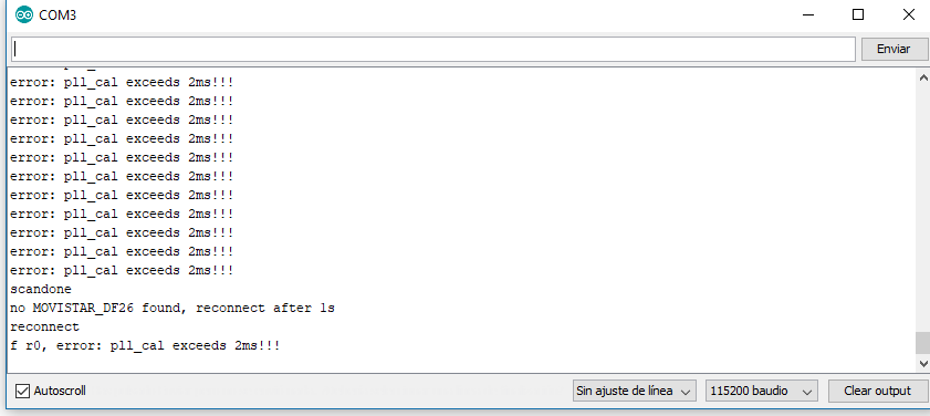 Si conectamos al salida del puerto serie del IDE de Arduino entonces veremos con asombro el origen del problema : el error pll_cal exceeds 2ms.