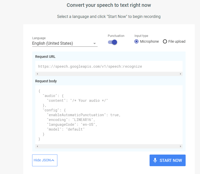 Si quiere probar esta funcionalidad esta es la url : https://cloud.google.com/speech-to-text/