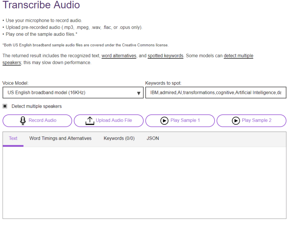 El servicio IBM Watson Speech to Text utiliza capacidades de reconocimiento de voz para convertir el árabe, el inglés, el español, el francés, el portugués de Brasil, el japonés y el mandarín en texto.Este sistema por el momento se usa o para fines de demostración y no está destinado a procesar datos personales ,así que no se deben ingresar datos personales en este sistema, ya que puede no tener los controles necesarios para cumplir con los requisitos del Reglamento general de protección de datos (UE) 2016/679.