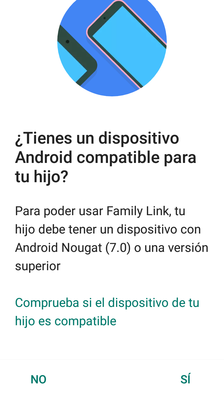 Enseguida nos va  a preguntar la cuestión  principal sobre el terminal del menor ya que se aconseja este  sea Android 7.0 (Nougat) o versiones posteriores.