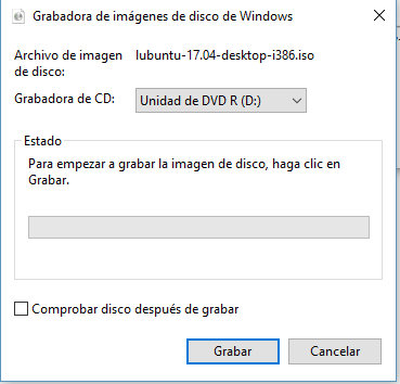 Al seleccionar la opción “Grabar imagen de disco”, aparecerá una ventana donde tendremos que seleccionar la unidad en la que vamos a grabar y si queremos o no verificar los datos del DVD una vez termine la grabación.