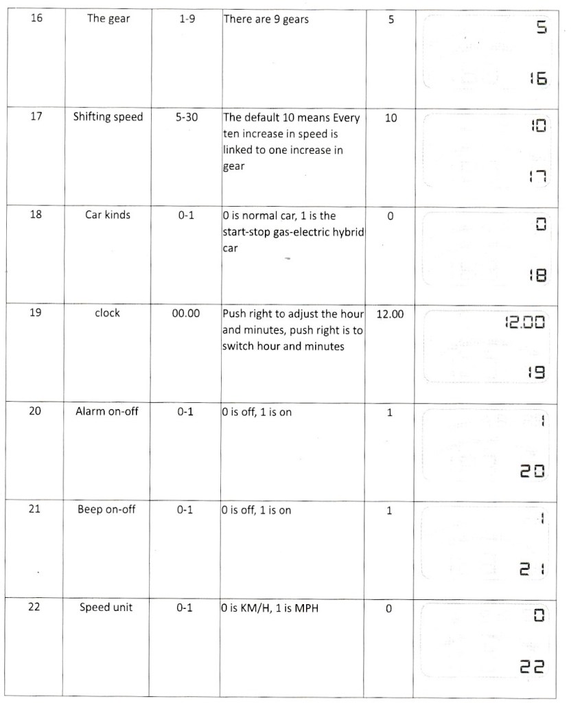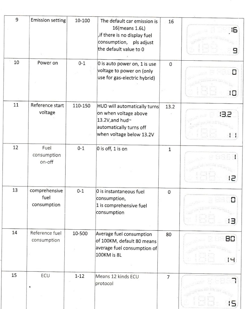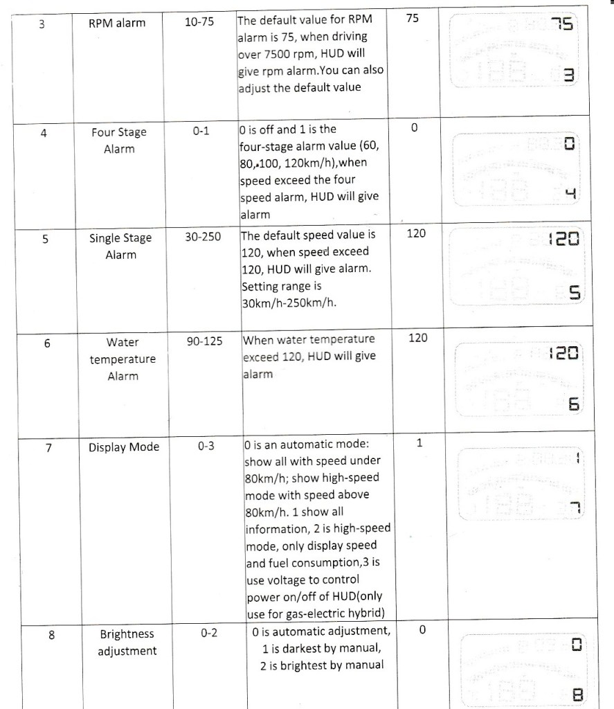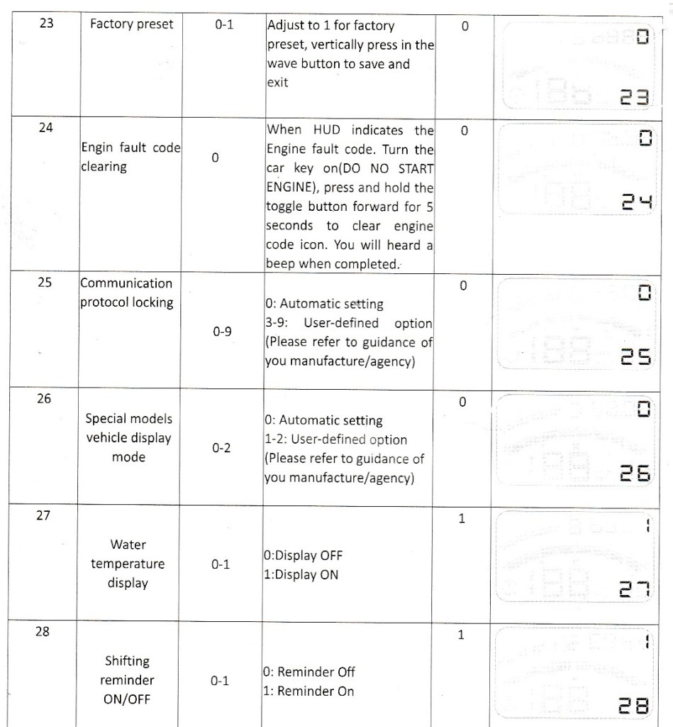 IMPORTANTE ; Observe especialmente el menú nº 23 (Factory Reset) , pues si se ajusta a la izquierda al valor 1, y luego con una pulsación larga en el botón central por 5 segundos para salvar y salir , llevara al modelo VGEBY Universal HUD a la configuración de fábrica.