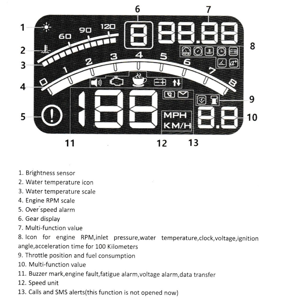 Mediante la función de visualización se pueden mostrar : Velocidad de conducción, velocidad del motor(RPM) , temperatura del agua, voltaje de la batería, consumo de combustible, conmutación libre entre kilómetro y milla, conmutación libre entre C y F.