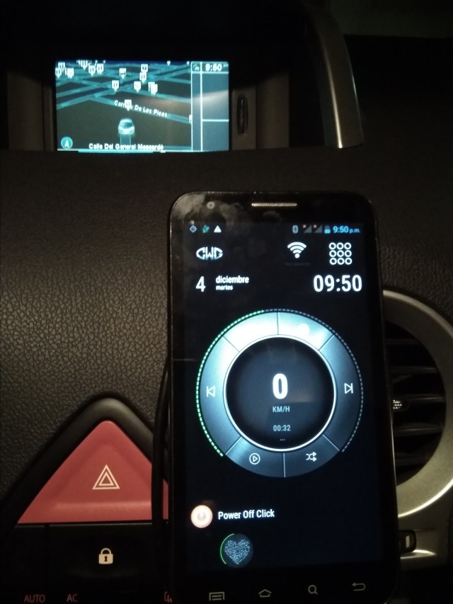 - De la esfera central circular donde puede cambiarse haciendo simplemente click por una brújula , el logo de la marca del coche, un reloj , el tema que se esta reproduciendo o incluso un navegador