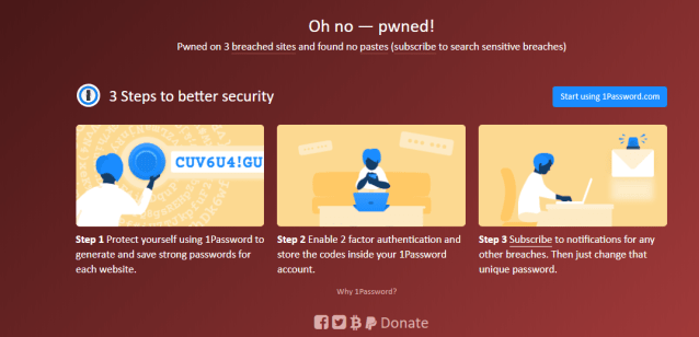 4. Si le  aparece el mensaje “Oh no — pwned!” significa que sus datos han sido comprometidos. Un poco más abajo de hecho podrá  ver los sitios en los que su información fue robada (aparecerá Collection #1 y quizás algún portal más que ni sabía que había sido hackeado).En este caso  lo mas razonable es  que cambie inmediatamente la contraseña asociada a sus cuentas de correo  que use para validarse en esos portales cuya vulnerabilidad  ha sido detectada . De hecho, lo mejor y más seguro es que use alguna app generadora de contraseñas para configurar una password que sea fuerte y sólida.También es encarecidamente  recomendable que use la autenticación en 2 pasos en todos los servicios que  lo permitan