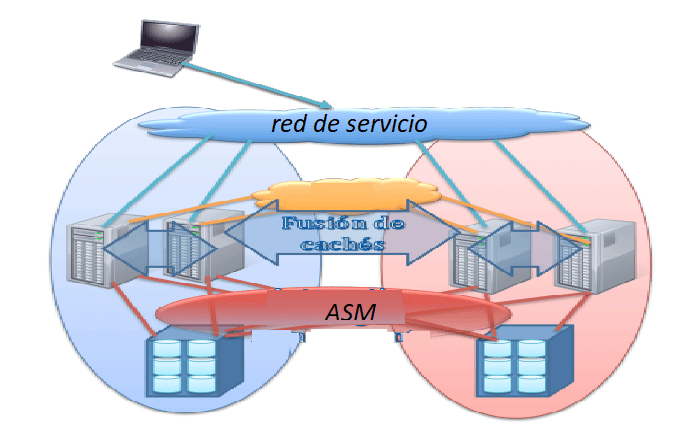 Existe una capa de software,Oracle ASM (Automatic Storage Management),que gestiona el almacenamiento de forma que todos nodos vean los discos que les presentan las cabinas como un único pool de almacenamiento. Los nodos se comunican entre sí mediante una red privada (red de interconnect) a Giga. A través de esta red intercambian información de lo que esta haciendo cada nodo y realizan una fusión de caches (todos los nodos comparten la caché), que es lo que permite que la ca¡da de uno de ellos sea transparente para la sesión del usuario. Todas la interfaces de red, tanto las del interconnect como las de la red de servicio deben estar redundadas (mediante bonding en Linux, IPMP en Solaris,etc.)para evitar que constituyan un punto de fallo.