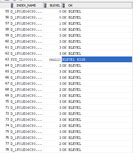 Los índices que deberíamos de reconstruir son los que en la columna ok aparecen como BLEVEL HIGH.