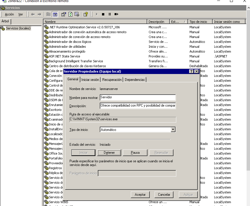 Una vez sepamos que hay conectividad tcp/ip desde nuestro w10 al w2000 tendremos que comprobar que tiene los servicios de transferencia de ficheros iniciados ,