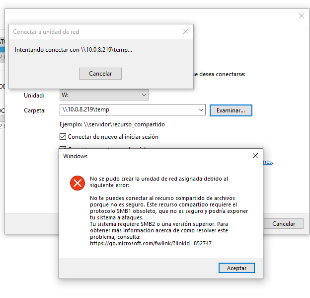 No se puede conectar con los recursos compartidos de archivos porque no es seguro. Este recurso compartido requiere el protocolo SMB1 obsoleto, el cual no es seguro y podría exponer su sistema a ataques.