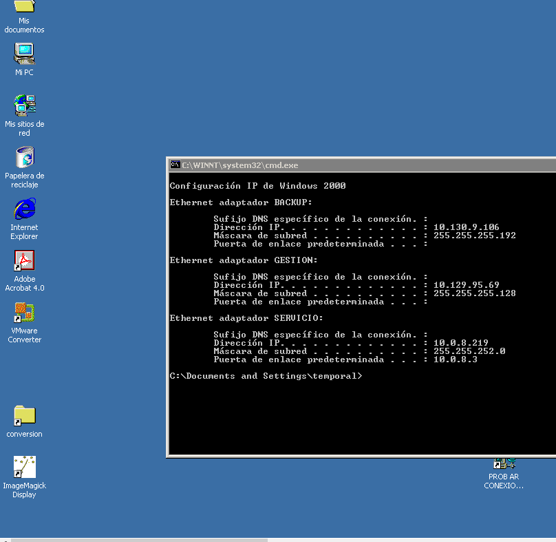 Si lo intenta , lo primero ya sabemos deberia ser comprobar la conectividad a esa máquina desde nuestro w10 ,para lo cual lo primero es lanzar el comando Ipconfig en el W2000 para saber la dirección IP del servidor