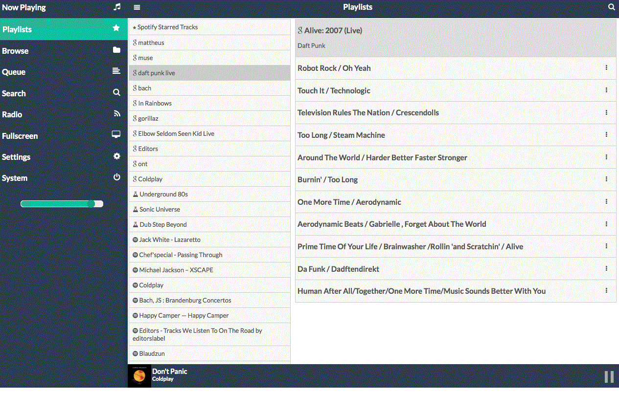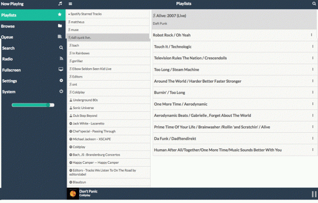 - Ordenador con un navegador moderno; tableta o teléfono. La interfaz web se prueba con versiones recientes de Firefox, Chrome, Internet Explorer e iOS (iPad/iPhone), versiones modernas de Android (Chrome Mobile, Firefox Mobile). Internet Explorer versión 10 funciona, las versiones anteriores no. También puede utilizar un cliente MPD para conectarse.
