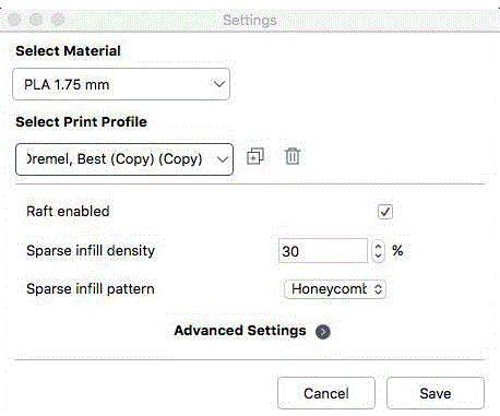 - Configuración. Seleccione un material, un perfil de impresión predefinido, cree un perfil de impresión personalizado y ajuste la configuración avanzada de la impresora.