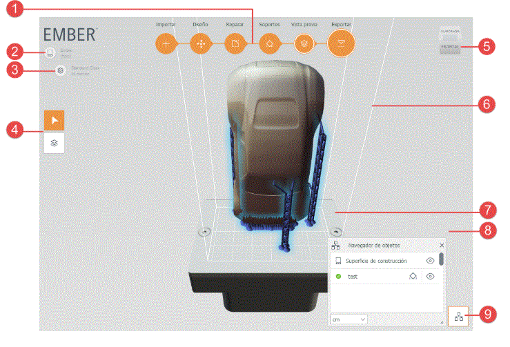 - Superficie de construcción. En ocasiones denominada base, representa la ubicación a la que se adhieren los modelos durante la impresión.