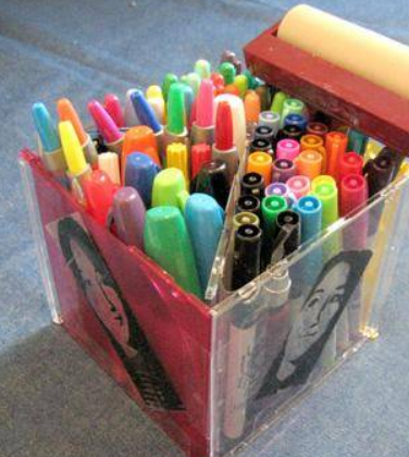 Otra idea es decorar un cubo por el exterior como más nos guste colocando en su interior un separador , obteniendo con ello originales cajas para almacenar utensilios de papelería