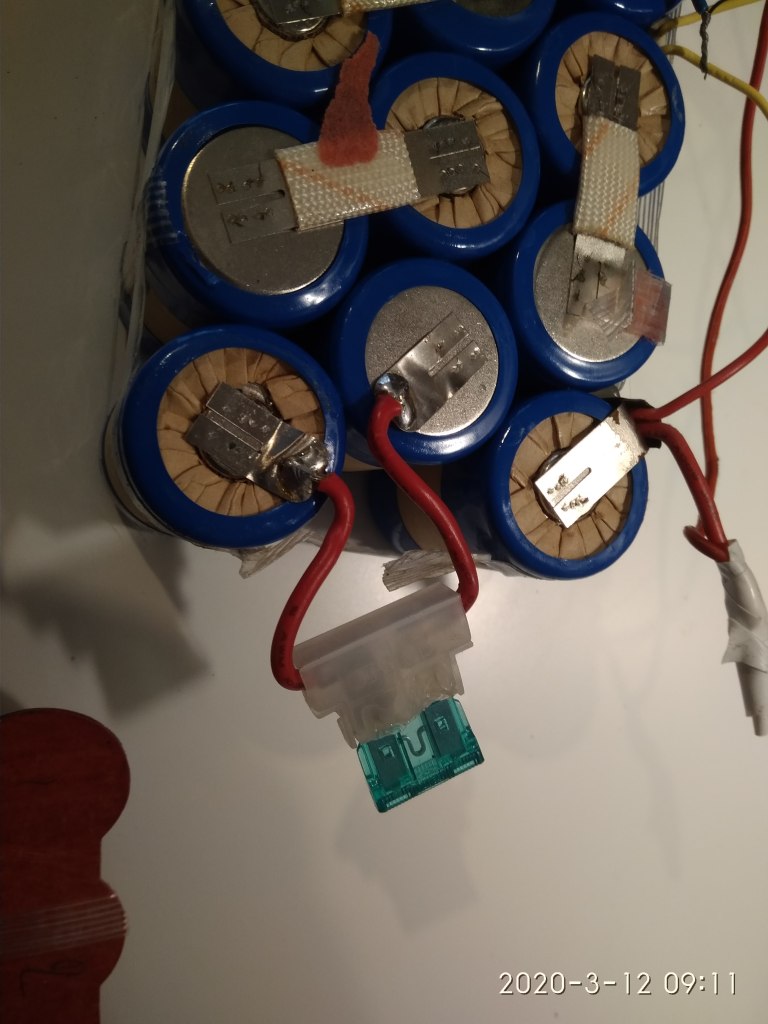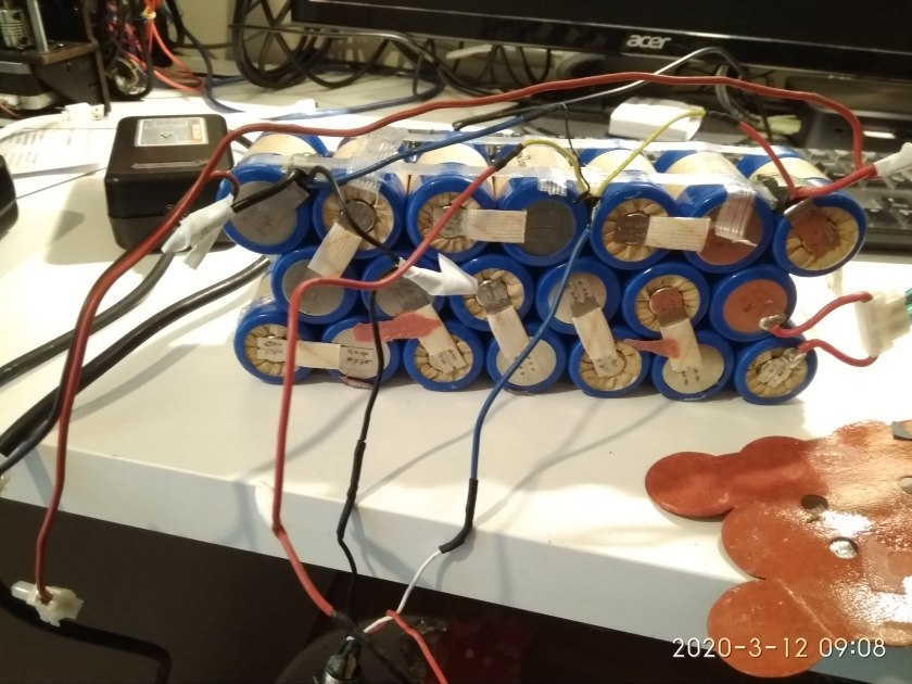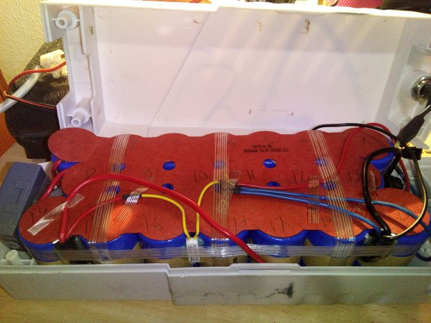 Una vez levantados los  aislantes que cubren las 20  células de Nimh, las cuales  están conectadas en serie  ,   configuración que nos da una salida  de  1.2×20=24v