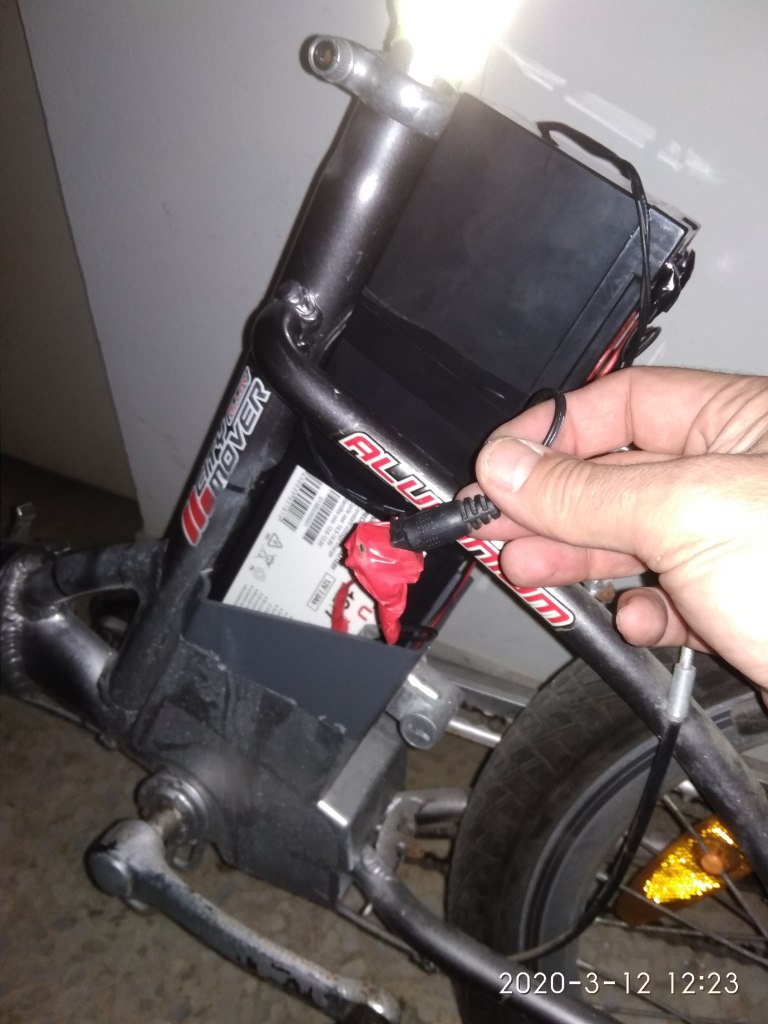 5-Conectaremos un conector  hembra en la bicicleta  ( por ejemplo reciclando el conector  externo de un viejo router de ADSL). Mucho cuidado de no confundir el polo positivo   y el polo negativo  a la hora de  soldar los hilos al conector.
