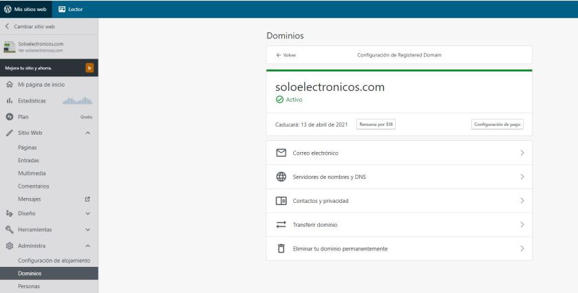 Un sitio de WordPress.com incluye una dirección gratuita por medio de  un subdominio de WordPress.com, como por ejemplo  misubdominio.wordpress.com  , pero puede  quitar la parte de “.wordpress.com” y usar directamente un nombre de dominio personalizado, como por ejemplo midominio.com, pero para ello  tendrá que pagar una mínima cantidad para que  precisamente ese nombre de dominio sea exclusivo en toda la red ( es decir tendrá que pagar la gestión del dominio  )